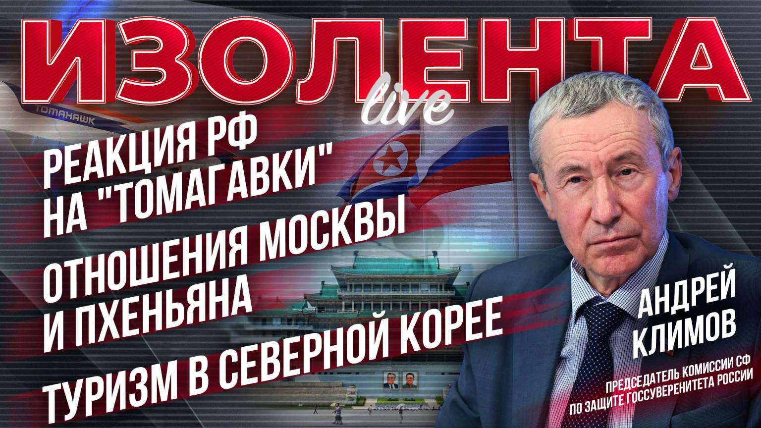 Как Россия отреагирует на поставки ракет "Томагавк"? Каким странам невыгодно сближение России и США? Как формировались отношения Москвы и Пхеньяна? О этом и не только говорили в эфире «ИзолентаLive» с координатором российского парламентского «Евразийского диалога», доктором экономических наук, членом Бюро Высшего совета Партии «Единая Россия» Андреем Климовым. Андрей Климов: https://t.me/rusaccent Пётр Лидов: https://t.me/pvsgns Трофим Татаренков: https://t.me/NeBrigada Задонатить, участвовать в голосовании и задать вопрос можно тут: https://donate.stream/izolentalive. Нравятся наши выпуски? Подпишись на «Изолента+»: https://t.me/tribute/app?startapp=sr3 Изолента в Телегам https://t.me/izolentalive Изолента ВКонтакте https://vk.com/izolentalive Изолента в Одноклассниках: https://ok.ru/group/70000002758400 Кулинарный проект "Мужики на кухне": https://t.me/tribute/app?startapp=si76 Радио Sputnik: https://t.me/radio_sputnik «ИзоТОЛК» — это новый проект «ИзолентаLive» и «Изолента+»! Есть что сказать? Оставь заявку здесь: https://t.me/IzoTalkBot. Книга Трофима «Темник», как говорят злые языки, главная книга года. Купить её можно тут: https://litgid.com/catalog/sovremennaya_proza/temnik/