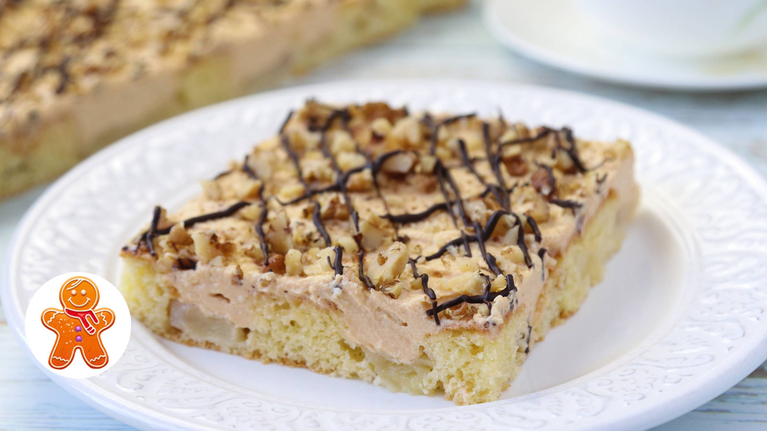 Для теста на противень 30х40 см: 300 г муки 4 крупных яйца 250 г сахара 125 г сливочного масла 100 мл молока 10 г разрыхлителя для теста 8 г ванильного сахара 5 крупных яблок Для крема: 500 мл сливок или молока 50 г кукурузного крахмала 100 г сахара или по вкусу 8 г ванильного сахара 120 г сливочного масла 200 г вареной сгущенки Для украшения: 50 г грецких орехов 50 г шоколада
