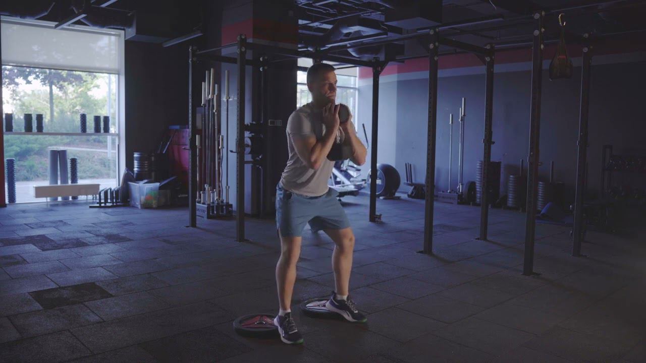 Гоблет приседания с гантелью с блинами под пятками/ Heel elevated DB goblet squat