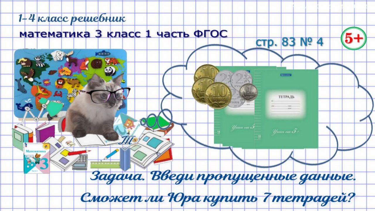 Составная задача с пропорциональными величинами цена, количество, стоимость. Введи пропущенные данные. Сможет ли Юра купить 7 одинаковых по цене тетрадей? страница 83 номер 4 математика 3 класс 1 часть Моро 2023 г. ФГОС гдз Если нашли ошибку, напишите, пожалуйста, в комментариях. Сайт с текстовым содержанием: https://dzen.ru/id/650204661aba9b0ba4b2643e #обучениематематике#математика3класс1частьстр83номер4#составнаязадача#задачаспрпорциональнымивеличинами#ценаколичествостоимость#задачавведипропущенныеданные#сможетлиюракупить7одинаковыхтетрадей#математика3класс1частьФГОС#математика3кл1чФГОС#математика3класс1частьморо2023#обучениедетей#длядетей#решебникматематика3класс#гдзматематика3класс#начальныеклассы#1-4классрешебник+