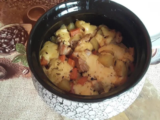 Здравствуйте. Начнем? Экспромт к обеду. Не знаю уж почему, но именно экспромты неизменно удаются лучше всего. ) Филе куриных бедрышек - 2 морковь -1 некрупная помидор - 1 шт. картофель - 2 шт. луковица - 1 шт. сладкий перец - половина или 1 небольшой соль и черный перец - по вкусу соус "терияки" - 1 салатная ложка лавровый лист - 1 шт. сливочное масло - 10-20 г сыр любой - по велению души горшочек, подаренный хорошим другом. Все порезать кусками среднего размера, выложить слоями: филе, морковь, перец, картофель, снова филе и т.д. Поверх - помидор кусочками. Хорошо бы и грибы, но их у меня сегодня нет. Луковицу кладем целиком, так удобнее ее вынимать. Соль по вкусу, если не хватит соли, что есть в соусе. Приправы - паприка, черный перец, базилик, сухой имбирь. Добавить "Терияки", лаврушку и сливочное масло кубиками. Воду не добавляю, достаточно влаги продуктов, соуса и масла. Закрыть крышкой и отправить в духовку, прогретую до 180 градусов до готовности. Пробую: готово. Перемешиваю, пора добавить сыр. Можно не натирать теркой, достаточно порезать крупными кубиками, он растает и разойдется. И снова в духовку на несколько минут. Блюдо получается нежным, с ароматным соком. Приятного аппетита. Буду очень благодарна за ваши отзывы и КОНСТРУКТИВНУЮ критику. Поддержите развитие канала - подпишитесь, поставьте лайк. Спасибо.