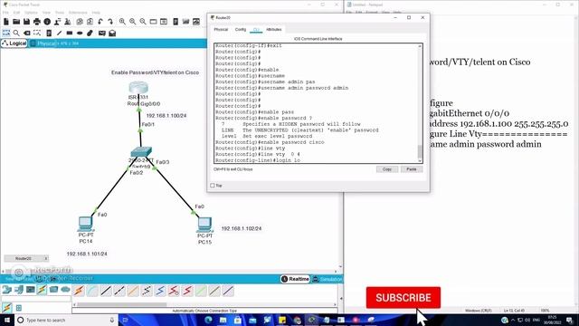 #level2Networks Channel Link : #Level2networks Youtube Channel : https://www.youtube.com/watch?v=Vq75a2Brew8&list=PLPqVqAjxFZQzfAFjzDdVKDiEThbvzjHXf. Line Vty 0 4 Configuration Cisco Router Start ! Make Topology , login in Router to configure Router(config)#int gigabitEthernet 0/0/0 Router(config-if)#ip address 192.168.1.100 255.255.255.0 ==========Configure LinVty=============== username admin password admin enable password cisco line vty 0 4 login local =============Verify====== start to ping from PC to Router interface its pinging-----OK from PC telnet 192.168.1.100 Username: admin Password: ******* its working thanku ! Channel Link : #Level2networks Youtube Channel : https://www.youtube.com/watch?v=Vq75a2Brew8&list=PLPqVqAjxFZQzfAFjzDdVKDiEThbvzjHXf.