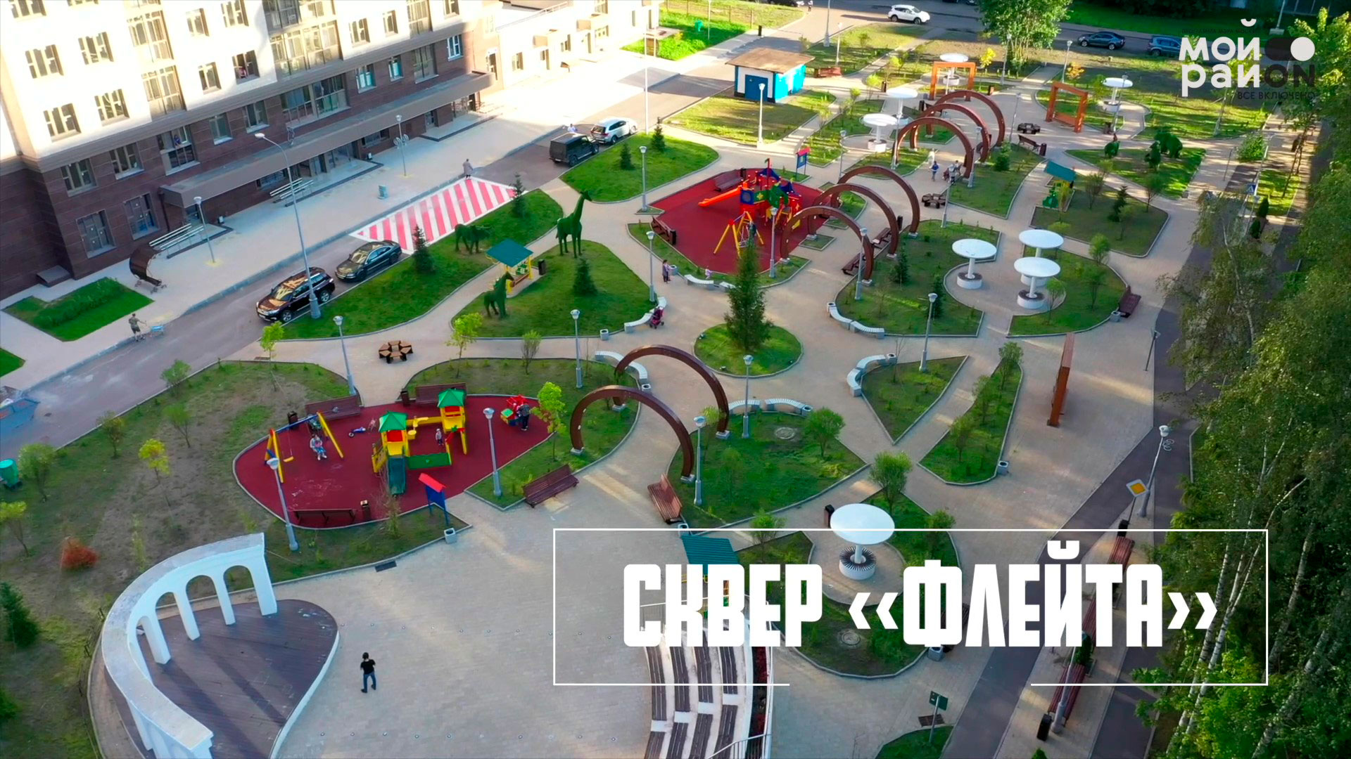 Иногда московские парковки превращаются… в элегантные скверы. И пространство для отдыха у корпуса 360 в Савелках – отличный пример таких перемен. В 2019 году здесь появился по-настоящему «карманный» парк у дома. При всей своей компактности чего здесь только нет! Скамейки-«цветочки», скамейки-«грибочки», качели, забавные топиарные фигуры, детские площадки и даже амфитеатр с велодорожкой. «Мал да удал» – это точно про сквер «Флейта». Он настолько симпатичный, что с высоты выглядит словно часть игрушечного идеального городка. Давайте вместе совершим видеопутешествие по нему?