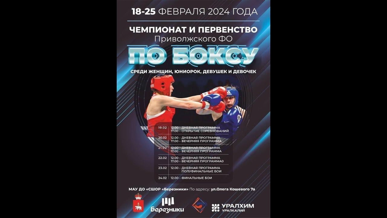 Чемпионат Приволжского федерального округа по боксу среди женщин 19-40 лет. ,(1984-2005 гг.р.), Первенство Приволжского федерального округа по боксу среди юниорок 19-22года (2002-2005 гг.p.) среди юниорок 17-18 лет (2006-2007 гг.p.), среди девушек 15-16 лет (2008-2009гг.р.), среди девушек 13-14 лет ( 2010-2011гг.р) Подписаться на канал: https://www.youtube.com/c/RussianBoxingFederation/?sub_confirmation=1 Федерация бокса России: http://rusboxing.ru/ ВКонтакте: http://vk.com/rusboxing Телеграм: http://t.me/RussianBoxers Одноклассники: http://ok.ru/group/64339915505917/ Дзен: https://zen.yandex.ru/rusboxing Состав пар 1-95 Филиппова Анна Чувашия Хайрутдинова Диляра Татарстан Весовая категория 44 кг 2-96 Панаева Александра Татарстан Сабирова Карина Татарстан Весовая категория 46 кг 3-97 Морозова Вероника Самарская Колчина Ксения Башкортостан Весовая категория 60 кг 4-98 Войнова Валерия Нижегородская Зимнова Татьяна Самарская Весовая категория 64 кг 5-99 Крашенинникова Надежда Кировская Янчикова Валерия Ульяновская Весовая категория 70 кг 6-100 Степанова Арина Башкортостан Баранова Ярослава Ульяновская ПОЛУФИНАЛ Весовая категория 48 кг 7-101 Жукова Милана Нижегородская Дорогойченкова Дарья Самарская 8-102 Хуснутдинова Камила Татарстан Джуламанова Алина Оренбургская Весовая категория 54 кг 9-103 Панкова Дарья Ульяновская Рамазанова Камила Татарстан 10-104 Жахьянова Даяна Самарская Агзамова Арина Татарстан Девушки 15-16 лет ПОЛУФИНАЛ Весовая категория 46 кг 11-105 Зюряева Надежда Самарская Есина Ульяна Оренбургская 12-106 Исхакова Карина Башкортостан Барышева Алиса Пермский Весовая категория 48 кг 13-107 Ефремова Полина Оренбургская Фахуртдинова Камила Ульяновская 14-108 Ермольченко Сабина Ульяновская Ефремова Марина Чувашия Весовая категория 50 кг 15-109 Галлямова Эльмира Башкортостан Одинцова Кристина Нижегородская 16-110 Романова Алина Пензенская Хижова Виктория Оренбургская Весовая категория 52 кг 17-111 Болдова Екатерина Пермский Савина Арина Татарстан 18-112 Боровкова Эльза Оренбургская Позилова Азизахон Саратовская Весовая категория 54 кг 19-113 Александрова Ангелина Ульяновская Мишина Надежда Татарстан 20-114 Дозджанова Эмиля Оренбургская Юнусова Вероника Башкортостан Весовая категория 57 кг 21-115 Дворкина Диана Ульяновская Сафиуллина Дина Татарстан 22-116 Кузьмина Анна Башкортостан Панечкина Анастасия Ульяновская ПЕРЕРЫВ 30 минут ЧЕМПИОНАТ И ПЕРВЕНСТВО ПРИВОЛЖСКОГО ФЕДЕРАЛЬНОГО ОКРУГА ПО БОКСУ г. Березники Пермский край СШОР «Березники» 18-25 февраля 2024 года Девушки 15-16 лет Весовая категория 60 кг 23-117 Овсянникова Софья Нижегородская Чалина Дарья Пермский 24-118 Стрельцова Яна Оренбургская Фахуртдинова Алина Ульяновская Весовая категория 63 кг 25-119 Хайруллина Азалия Башкортостан Кучина Анна Нижегородская Весовая категория 66 кг 26-120 Коннова Полина Оренбургская Терентьева Надежда Татарстан 27-121 Артамонова Анастасия Татарстан Федорова Александра Кировская Весовая категория 70 кг 28-122 Лапина Полина Мордовия Новиченкова Ульяна Ульяновская 29-123 Баткишева Аделина Саратовская Ситникова Ольга Кировская Весовая категория 80 кг 30-124 Богданкевич Полина Мордовия Трофимова Юлия Татарстан Юниорки 19-22 лет ФИНАЛ Весовая категория 48 кг 31-125 Актуганова Валенрия Татарстан Шатина Екатерина Нижегородская Весовая категория 50 кг 32-126 Карлова Ксения Башкортостан Афанасьева Валерия Саратовская Весовая категория 52 кг 33-127 Гараева Зиля Татарстан Яковлева Алсу Оренбургская Весовая категория 63 кг 34-128 Козашвилли Жанна 