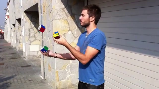 Жонглёр на лету собирает кубик Рубика.