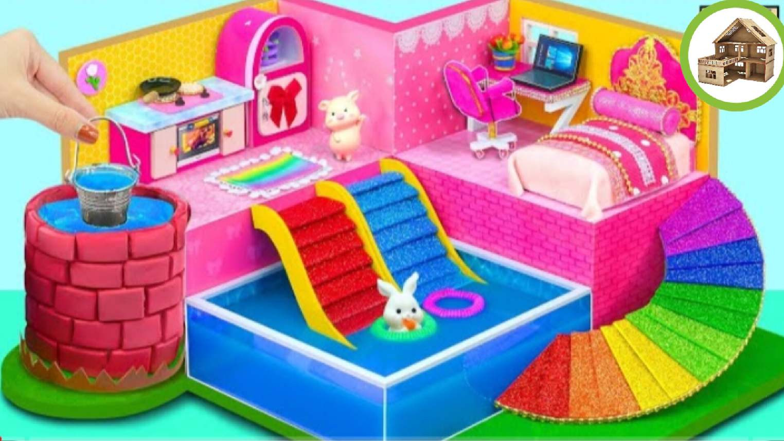 Миниатюрный домик с 3 водными горками в бассейне и колодцем своими руками из картона |114