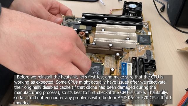 In this tutorial, I'm showing my method of modding a K6-2+ CPU (which has 128 KB of L2 cache) to a K6-3+ (with the full 256 KB of L2 cache). As shown in the video, all you need to do is move one of the resistors and, if you're lucky, you will end up with a perfectly functional K6-3+ CPU. Back in the day, AMD was very sneaky, and on more than one occasion, they sold higher tier CPUs disguised as lower tier (especially because their yields with the 180nm lithography process were known to be particularly good). This only works for "plus" type CPUs, so if you have a standard K6-2, don't even attempt to do this, IT'S NOT GOING TO WORK! The CPU die of a standard K6-2 completely lacks the L2 cache, so there is nothing to activate. BIG WARNING: There is no guarantee that your CPU will be stable following this procedure. In my case, I was very lucky and it has worked flawlessly 4 out of 4 times, however, I've only modded 570 MHz K6-2+ CPUs (which are higher quality silicon, with a higher chance of having a fully working L2 cache). Your mileage may vary, especially if you try and do the same with lower clocked SKUs (although there are certainly people who have had success with slower clocked CPUs as well). Also, this procedure obviously involves a certain amount of risk, so I'm in no way responsible if you damage your CPU!