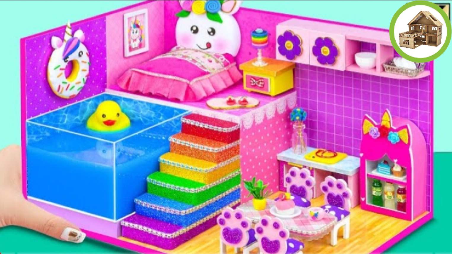 Миниатюрный домик для единорога с огромным бассейном из глины и картона #43