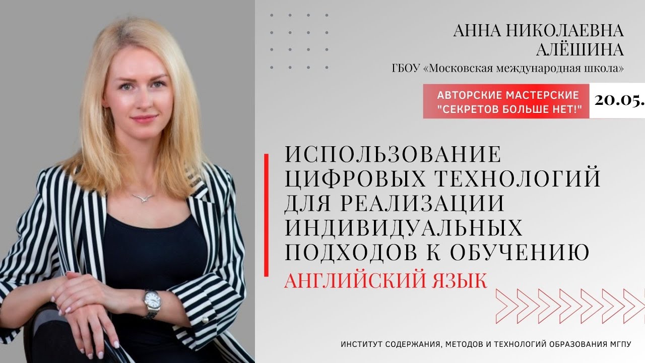 Ведущая: Алёшина Анна Николаевна, учитель английского языка ГБОУ «Московская международная школа» Тема: "Использование цифровых технологий для реализации индивидуальных подходов к обучению"
