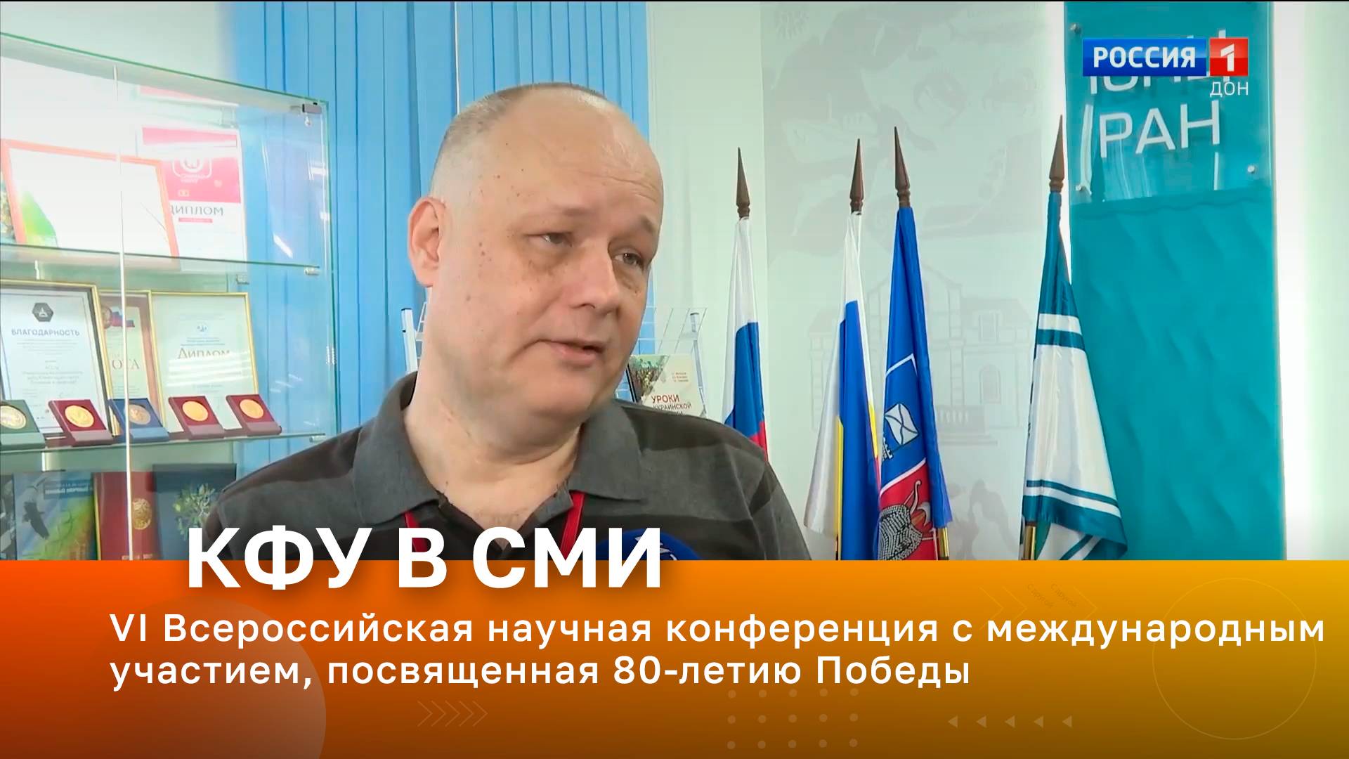 Телеканал «Россия 1. Дон». В эфире – профессор кафедры истории России КФУ им. В.И. Вернадского Олег Романько Тема эфира – VI Всероссийская научная конференция с международным участием, посвященная 80-летию Победы в Великой Отечественной войне «Великая Отечественная война в истории и памяти народов Юга России: события, участники, символы» в г. Ростов-на-Дону.