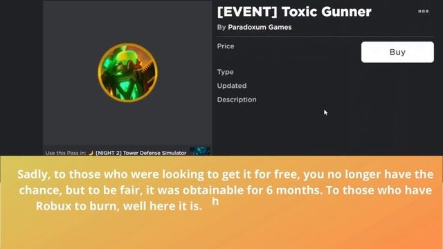 How to get the TDS Toxic Gunner Tower in 2021 (Last Chance) Subscribe for more epic content: https://www.youtube.com/channel/UCdtxvys_LIk3pSmGlT2bfrg ⭐Links to contacts:⭐ ? Twitter: https://twitter.com/qborg356 ? Discord ID: 658548122129006633 ? ROBLOX: https://www.roblox.com/users/1090796362/profile ? Music used in this video: Song: Cartoon - Why We Lose (feat. Coleman Trapp) [NCS Release] Music provided by NoCopyrightSounds Free Download/Stream: http://ncs.io/whywelose Watch: http://youtu.be/zyXmsVwZqX4 ▽ Follow Cartoon SoundCloud https://soundcloud.com/cartoonbaboon Facebook https://www.facebook.com/cartoondband Instagram https://www.instagram.com/cartoonbaboon #towerdefensesimulator #roblox #allyourtowerdefensesimulatorjoyinonevideo #tds Subscribe for more epic content: https://www.youtube.com/channel/UCdtxvys_LIk3pSmGlT2bfrg ⭐Links to contacts:⭐ ? Twitter: https://twitter.com/qborg356 ? Discord ID: 658548122129006633 ? ROBLOX: https://www.roblox.com/users/1090796362/profile #towerdefensesimulator #roblox #allyourtowerdefensesimulatorjoyinonevideo #tds What is Roblox? ROBLOX is an online virtual playground and workshop, where kids of all ages can safely interact, create, have fun, and learn. It’s unique in that practically everything on ROBLOX is designed and constructed by members of the community. ROBLOX is designed for 13 to 18 year olds, but it is open to people of all ages. Each player starts by choosing an avatar and giving it an identity. They can then explore ROBLOX — interacting with others by chatting, playing games, or collaborating on creative projects. Each player is also given their own piece of undeveloped real estate along with a virtual toolbox with which to design and build anything — be it a navigable skyscraper, a working helicopter, a giant pinball machine, a multiplayer “Capture the Flag” game or some other, yet-to-be-dreamed-up creation. There is no cost for this first plot of virtual land. By participating and by building cool stuff, ROBLOX members can earn specialty badges as well as ROBLOX dollars (“Robux”). In turn, they can shop the online catalog to purchase avatar clothing and accessories as well as premium building materials, interactive components, and working mechanisms. tower defense simulator is a game in roblox also known as tds. tower defense simulator roblox is also roblox tower defense simulator (roblox tower defense simulator codes or roblox tower defense simulator code 2021) with tower defense simulator trailer and frost invasion tds so i look up how to beat frosy invasion without toxic gunner sinc I don't have tds toxic gunner. also how to beat tds frost event and tower defense simulator script with tower defense simulator free coins. how to get accelerator in tower defense simulator is also tds sledger and tds codes and tower defense simulator tower defense simulator solar eclipse tds solar eclipse tds update or all your tower defense simulator pain in one video