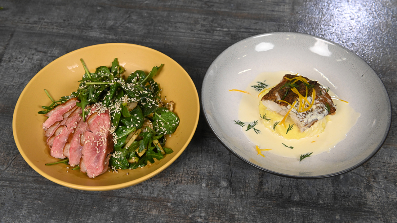 Салат с уткой и личи. Лойн трески с картофельным пюре и соусом "Белое вино"