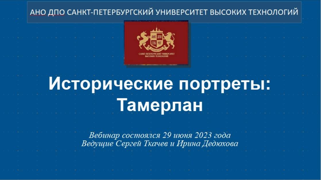 Исторические портреты: Тамерлан (2023) Вебинар Книжной лавки на эту тему состоялся 29.06.2023 г. Видео материал к вебинару, вырезан из ролика из-за ограничения по времени - http://my.mail.ru/mail/al3101961/video/16/1519.html Ведущие Сергей Ткачев и Ирина Дедюхова Смотреть по теме: Исторические портреты: Тамерлан https://ogurcova-portal.com/istoricheskie-portrety-tamerlan/ Источники: Научно-технический портал «Технарь» https://ogurcova-online.com/ "Книжная лавка" https://ogurcova-portal.com/ "Литературное обозрение" https://litobozrenie.com/ Вебинар разработан и проведен в рамках образовательных программ АНО ДПО СПБ УВТ - Санкт-Петербургский университет высоких технологий https://univer.spb.ru/ в соответствии с законодательством об образовательной деятельности в РФ N 273-ФЗ по лицензии №3911 Комитета по образованию Правительства СПб https://univer.spb.ru/wp-content/uploads/2019/12/license015small-1.jpg