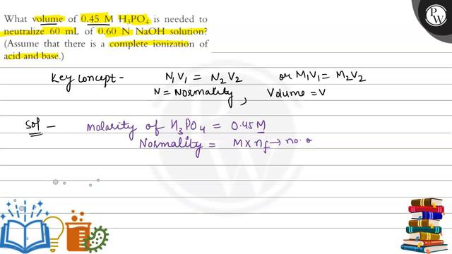 What volume of 0.45 MH_3PO_4 is needed to neutralize 60 mL of 0.60 NNaOH solution? (Assume that there is a complete ionization of acid and base.) 📲PW App Link - https://bit.ly/PW_APP 🌐PW Website - https://bit.ly/PW_APP 📌 PHYSICS WALLAH OTHER CHANNELS : 🌐 PhysicsWallah -Alakh Pandey: https://youtube.com/@PhysicsWallah 🌐 Alakh Pandey: https://youtube.com/@alakhpandey1414 🌐 JEE Wallah: https://youtube.com/@jee_wallah 🌐 Competition Wallah: https://youtube.com/@competitionwallah 🌐 PW Foundation: https://youtube.com/c/PhysicsWallahFoundation 🌐 NCERT Wallah : https://www.youtube.com/channel/UC8zCnnfhz-dvIpVdZ1CheuA 🌐 Defence Wallah-NDA: https://youtube.com/channel/UC8OCoGX9tmMneOzIFUTWq2Q 🌐 PhysicsWallah English: https://youtube.com/@EnglishPW 🌐 PW Vidyapeeth: https://youtube.com/@VidyapeethPW 🌐 Commerce Wallah by PW: https://youtube.com/@commercewallahpw 🌐 CA Wallah bt PW: https://www.youtube.com/channel/UC2amkJX5zDyQJ0mDajAWRSA 🌐 PW Sarkari Exam: https://youtube.com/@PWSarkariExams 🌐 PW - Hindi Medium: https://youtube.com/@physicswallahhindimedium 🌐 PW Bangla: https://youtube.com/@pwbangla 🌐 PW Maharashtra: https://youtube.com/@PWMaharashtra 🌐 PW Telugu: https://youtube.com/@PWTelugu 🌐 PW Kannada: https://youtube.com/@PWKannada 🌐 PW Gujarati: https://youtube.com/@PWGujarati 🌐 PW Facts: https://youtube.com/@pwfacts 🌐 PW Insiders: https://youtube.com/channel/UCHMWQFr9Nwo3wJsAap2Wnfw 🌐 PW Little Champs: https://youtube.com/@pwlittlechamps 🌐 PW Pathshala: https://youtube.com/channel/UCcXUY9NSMyYbkOvUD97CUmA 🌐 Banking Wallah : https://www.youtube.com/channel/UCg5_K50hLTKerLkSE7I1yWQ 🌐 SSC Wallah : https://www.youtube.com/channel/UCcaEVV7A47J4k9GFcqOOYkg 🌐 JEE Challengers by PW : https://www.youtube.com/channel/UCyf71tWV2abeN-l_UKiJ-5g 🌐 UPSC Wallah : https://www.youtube.com/channel/UCqOy6oOu6RPJNHYQ8f_Ybvg 🌐 UPSC Wallah हिन्दी : https://www.youtube.com/channel/UCmrP-DYdZuThp8AO9lnnwNw 🌐 GATE Wallah : https://www.youtube.com/channel/UC9PoSJoftLvEnXT-PtQ5Wtw 🌐 GATE Wallah - EC,EE & CS : https://www.youtube.com/channel/UCuGWIkiNaWjsCqybgxGuxfg 🌐 GATE Wallah - ME, CE & XE : https://www.youtube.com/channel/UCGrrw9x3_B_fItUIBMvqAUw 🌐 GATE English : https://www.youtube.com/channel/UCOsV75fSUr8gnMbhx-Qh3Lg 🌐 College Wallah : https://www.youtube.com/channel/UCDrf0V4fcBr5FlCtKwvpfwA 🌐 PW IIT JAM & CSIR NET : https://www.youtube.com/channel/UCuj28Zll58sztDqLiDhzgtQ 🌐 MBA Wallah : https://www.youtube.com/channel/UCWWEvCschv0T0rtou4VaKGw 🌐 Teaching Wallah : https://www.youtube.com/channel/UCUzqJZOkCejFoc5eqWWA9Eg 📌 PHYSICS WALLAH SOCIAL MEDIA PROFILES : 🌐 Telegram : https://t.me/pwjeewallah 🌐 Facebook : https://www.facebook.com/physicswallah 🌐 Instagram : https://www.instagram.com/pwjee_wallah/?hl=en 🌐 Twitter : https://twitter.com/physics__wallah 🌐 Linkedin : https://www.linkedin.com/company/78087354/admin/ 📌 For any queries or complaints Visit : https://bit.ly/PW_Queries