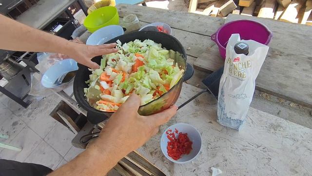 Муж готовит. Баранина с овощами в казане.