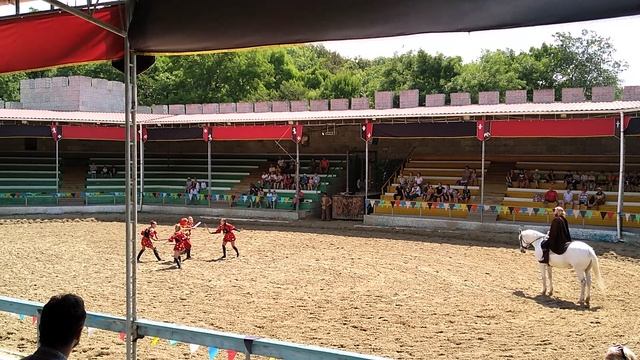 Представление средневекового шута с красавицами на рыцарском турнире.