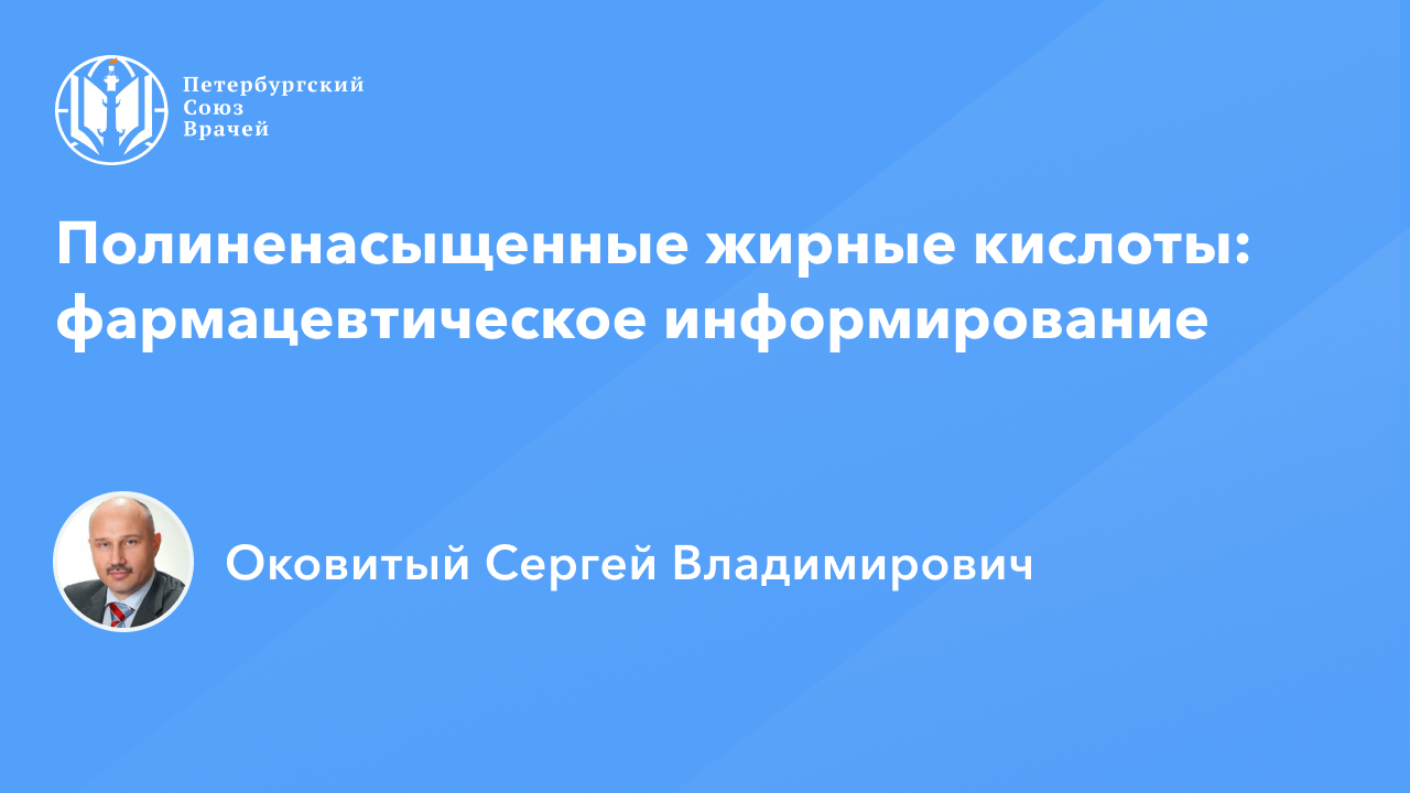 Видеозапись онлайн-семинара «Полиненасыщенные жирные кислоты: фармацевтическое информирование» Дата проведения: 07.04.2023, 20:00 Страница мероприятия: https://spb.doctor/i/23040720/ Программа: 1.Полиненасыщенные жирные кислоты: фармацевтическое информирование. Оковитый Сергей Владимирович 2. Роль фармработника в проведении эффективной и безопасной статинотерапии. Оковитый Сергей Владимирович 3. Ответы на вопросы О семинаре: В онлайн-семинаре будут освещены вопросы фармацевтического информирования по препаратам полиненасыщенных жирных кислот (ПНЖК), которые являются важным элементом поддержания здоровья пациентов. Будут представлены фармацевтические продукты, содержащие ПНЖК, используемые как БАД в рамках ответственного самолечения. Объективное, точное и исчерпывающее предоставление информации пациенту, при выполнении трудовых функций фармацевтическим работником, базируется на знании фармакокинетики, фармакодинамики и клинической фармакологии препаратов ПНЖК.