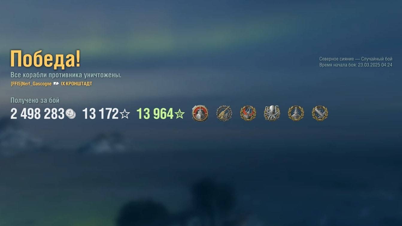 Крейсер Kronshtadt. Игрок: Nerf_Gascogne (NA). Карта: Северное сияние - Случайный бой. Урон: 194к. Kronshtadt - Крейсер СССР 9 уровня.