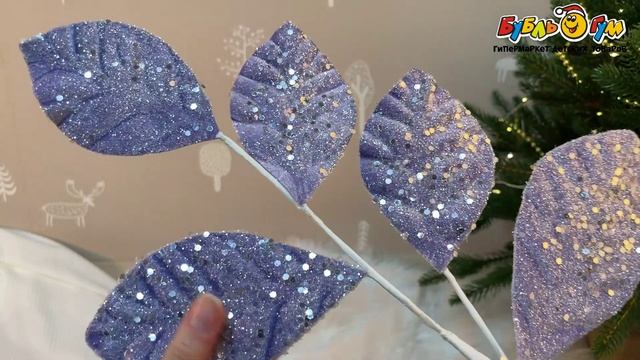 333057 Ветка с листьями декоративная с серебристыми пайетками сиреневый 50см