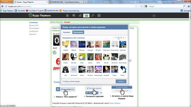 Будь Первым - социальная сеть новых возможностей. http://budpervym.com http://vk.com/budpervym https://twitter.com/budpervym Как будет проходить акция? - Акция состоит из 14 дней(туров). Каждый вечер будет определяться один из 14 финалистов акции, а видео определения будет выставлено в группе и на сайте. Каждому финалисту будет назначен номер ( от 1 до 14). Номер финалиста будет соответствовать дню акции(если 7 день акции, то финалист под номером 7). В финале акции среди 14 человек будет определен один, который и станет победителем!
