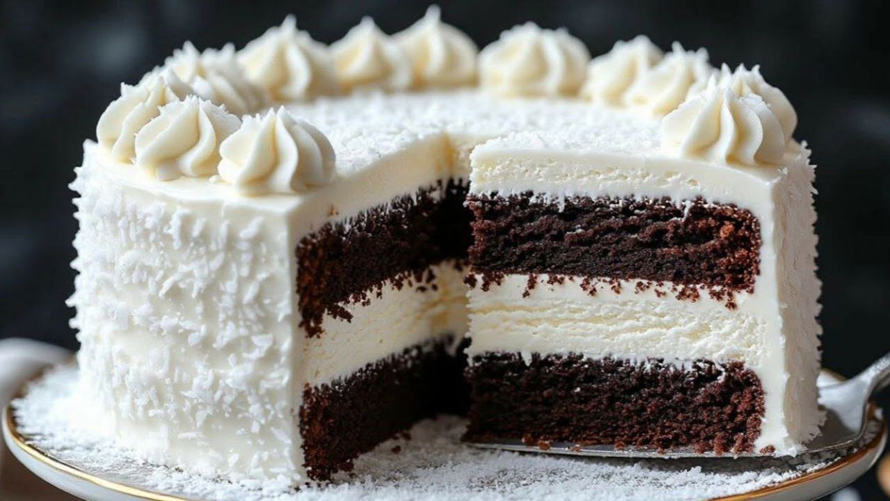 Ингредиенты: Бисквит: яйца (средние) — 5 шт.; соль — щепотка; сахар — 200 г; сливочное масло (комнатной температуры) — 200 г; мука — 250 г; разрыхлитель — 12 г; какао алкализованное — 50 г; молоко (тёплое) — 135 мл. Шоколадная карамель: сахар — 80 г; сливки 33 % (горячие) — 50 г; сливочное масло — 20 г; тёмный шоколад — 30 г. Крем: крем‑чиз (мягкий сыр) — 600 г; сахарная пудра — 70 г; сливки 33 % (холодные) — 200 г; ванильный экстракт — по вкусу. Декор: кокосовая стружка — 50–70 г. Пошаговый рецепт: 1. Приготовление бисквита: Разогрейте духовку до 180 °C. Подготовьте форму для выпечки (диаметр 20–22 см), смажьте маслом и застелите пергаментом. Взбейте яйца с солью и сахаром до светлой, пышной массы (5–7 минут). Добавьте размягчённое сливочное масло, перемешайте. В отдельной миске смешайте муку, разрыхлитель и какао, просейте. Постепенно вводите сухие ингредиенты в яичную массу, аккуратно перемешивая лопаткой снизу вверх. Влейте тёплое молоко, перемешайте до однородности. Вылейте тесто в форму, разровняйте. Выпекайте 35–40 минут (готовность проверьте шпажкой). Остудите бисквит в форме 10 минут, затем переложите на решётку до полного остывания. Разрежьте на 2–3 коржа. 2. Приготовление шоколадной карамели: В сотейнике растопите сахар на среднем огне до янтарного цвета (не перемешивайте!). Снимите с огня, аккуратно влейте горячие сливки (масса будет бурлить), перемешайте. Добавьте сливочное масло и тёмный шоколад, растопите до однородности. Остудите до комнатной температуры. 3. Приготовление крема: Взбейте крем‑чиз с сахарной пудрой до однородности. В отдельной миске взбейте холодные сливки до устойчивых пиков. Аккуратно введите взбитые сливки в сырную массу, перемешайте лопаткой. Добавьте ванильный экстракт, перемешайте. 4. Сборка торта: На блюдо выложите первый корж, нанесите слой крема. Поверх крема распределите шоколадную карамель. Накройте вторым коржом, повторите слои (крем + карамель). Верх и бока торта покройте кремом, разровняйте spatula. Посыпьте кокосовой стружкой. Поставьте в холодильник на 4–6 часов для пропитки. Советы для идеального результата: Бисквит: используйте алкализованное какао — оно даёт насыщенный цвет и вкус. Карамель: не перегревайте сахар, иначе появится горьковатый привкус. Крем: сливки и крем‑чиз должны быть холодными — так крем получится воздушным. Пропитка: дайте торту настояться в холодильнике минимум 4 часа — коржи станут сочнее. Декор: кокосовую стружку можно слегка поджарить на сухой сковороде для аромата. Приятного аппетита!