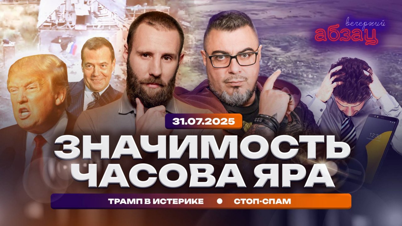 Концерт «Полного Абзаца» 26 октября в Москве https://shahnazarovabzats.intickets.ru/seance/60399997 Москва! 28 сентября 19:00 |ЦДРИ| Билеты по ссылке: https://shahnazarovfine.intickets.ru Санкт-Петербург! 5 октября 19:00 ДК им. В.А. Шелгунова Билеты по ссылке: https://shahnazarovspbfine.intickets.ru Екатеринбург 07 октября 19:00 Ben Hall Билеты по ссылке: https://shahnazarovekaterinburg.intickets.ru Тюмень 08 октября19:00 ДК ЖД Тюмень Билеты по ссылке: https://shahnazarovtumen.intickets.ru Пермь 21 октября 2025 19:00 ДК ЖД Билеты по ссылке: https://shahnazarovperm.intickets.ru Воронеж 31 октября 19:00 |ДК Железнодорожников Билеты по ссылке: https://shahnazarovvoronezh.intickets.ru Заказ книги Михаила Шахназарова «Тетерев мечты» https://ozon.ru/t/26N1Mjg Канал «Супы для СВОих_39» https://t.me/supdlyaSVOih39 =========== «Вечерний Абзац» с Тимофеем Ермаковым и Павлом Русским. Значимость Часова Яра. Трамп в истерике. Стоп-спам =========== Канал Абзац.Видео в Телеграм https://t.me/+dEU4NgtVn7kzMjBi =========== Подписывайтесь на соцсети «Абзаца»: Дзен: https://dzen.ru/absatzmedia ВКонтакте https://vk.com/absatzmedia Канал на ВК Live https://live.vkvideo.ru/absatzmedia Телеграм-канал https://t.me/absatzmedia ОК https://ok.ru/absatzmedia Наш Rutube https://home.strannik-j.org/u/absatzmedia Скачай приложение «Абзац» по ссылке https://www.rustore.ru/catalog/app/media.absatz.twa Сайт «Абзаца» https://absatz.media/ Павел Русский в ВК: https://vk.com/pavel_russkii