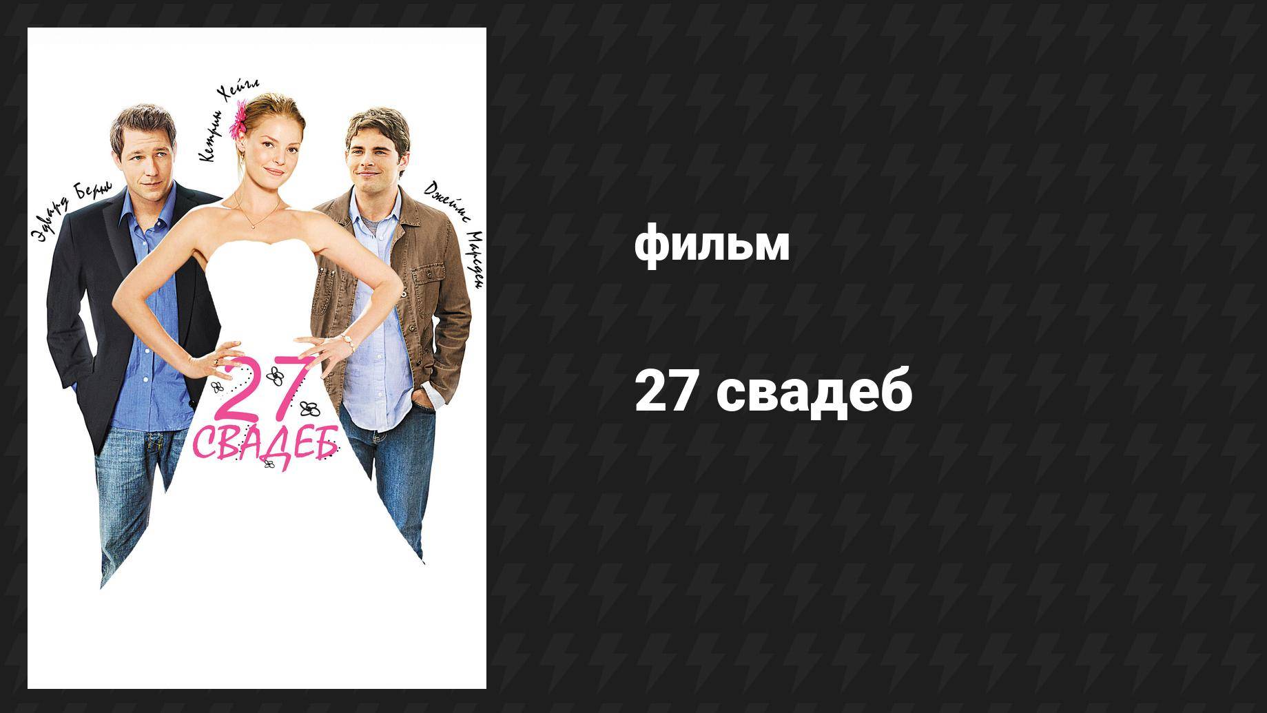 «27 свадеб» — романтическая комедия 2008 года. Фильм рассказывает историю женщины, которая много раз была подружкой невесты на свадьбах своих подруг, но никак не может найти свою собственную любовь. Главная героиня, Джейн Николс, — заботливая и самоотверженная женщина, которая любит помогать другим. Она была подружкой невесты уже 27 раз и гордится тем, что всегда готова поддержать своих друзей и близких в их самых счастливых моментах. Однако сама Джейн остаётся одинока, скрывая свои чувства к своему боссу Джорджу, в которого давно влюблена. Её мир рушится, когда её младшая сестра Тесс объявляет о помолвке с Джорджем, и Джейн вынуждена помогать в организации их свадьбы. На этом фоне Джейн знакомится с журналистом Кевином Дойлом, который видит в её «хобби» отличную тему для статьи. Кевин сопровождает её на свадебные церемонии и поначалу цинично относится к её увлечению, но вскоре начинает понимать её глубже. В процессе их общения Джейн начинает переосмысливать свои приоритеты и учится ставить собственное счастье на первое место. Год выпуска: 2008 Жанр: мелодрама, комедия Продолжительность: 106 мин. Режиссёр: Энн Флетчер В ролях: Кэтрин Хайгл, Джеймс Марсден, Эдвард Бёрнс, Малин Акерман, Джуди Грир, Брайан Кервин, Чарли Барсена, Пейтон Лист, Джейн Фитщ, Дженнифер Лим Cтрана: США Cтудия: Spyglass Entertainment, Fox 2000 Pictures Здесь вы можете посмотреть фильм 27 свадеб в русском синхронном переводе в хорошем качестве (4k, 2k, Full HD, 1080p) совершенно бесплатно.