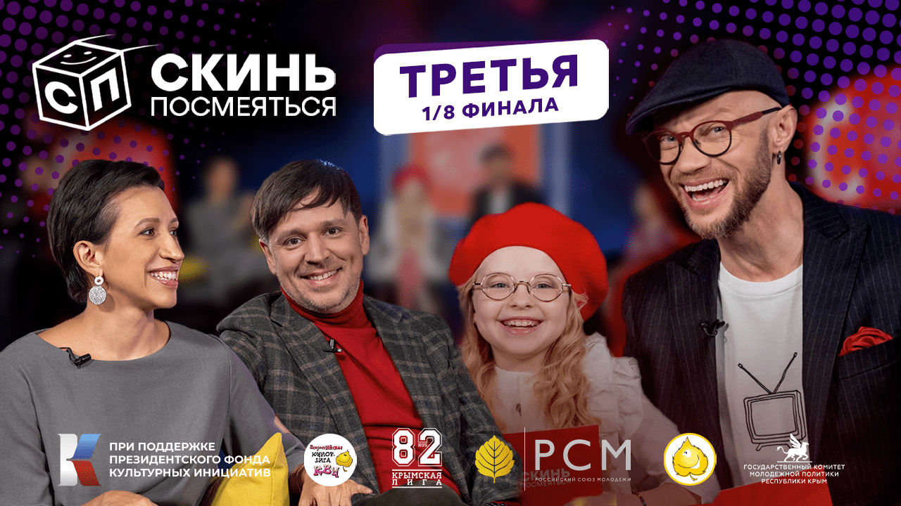 Третий выпуск 1/8 финала Международной детской онлайн-лиги КВН "Скинь посмеяться!" ВЕДУЩИЕ: — Дмитрий Хрусталёв — Ева Смирнова ЖЮРИ: — Евгений Донских и его сын Пётр Донских — Елена Борщева и её дочь Ума Юшкевич КОМАНДЫ ВЫПУСКА: 1. «Гравити Фолз», Республика Беларусь, г. Могилёв. 2. «Папа хотел сына», г. Славск. 3. «Настрой Настроение», г. Черкесск. 4. «M'n'Dance», г. Пятигорск. 5. «Вольт-Ампер», г. Астрахань. 6. «Выйди и зайди нормально», г. Ялта. Организаторы проекта: — Президентский фонд культурных инициатив — Всероссийская Юниор-Лига КВН — РОО «КРЫМСКАЯ МОЛОДЕЖНАЯ ЛИГА КВН» Партнёры проекта: — Российский союз молодёжи — Государственный комитет молодёжной политики Республики Крым VK — vk.com/sendjoke TG — t.me/sendjoke #скиньпосмеяться #фондкультурныхинициатив ТАЙМКОДЫ: 3:50 - Гравити Фолз 8:41 - Папа хотел сына 13:28 - Настрой настроение 19:20 - M'n'Dance 24:50 - Вольт-Ампер 30:14 - Выйди и зайди нормально