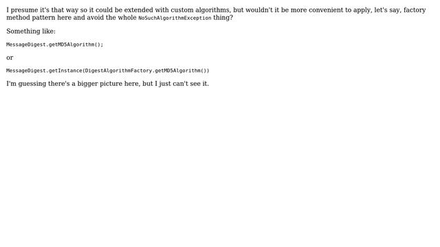 Software Engineering: Why does Java MessageDigest.getInstance() have a String as a parameter? Helpful? Please support me on Patreon: https://www.patreon.com/roelvandepaar With thanks & praise to God, and with thanks to the many people who have made this project possible! | Content (except music & images) licensed under CC BY-SA https://meta.stackexchange.com/help/licensing | Music: https://www.bensound.com/licensing | Images: https://stocksnap.io/license & others | With thanks to user Qwerky (softwareengineering.stackexchange.com/users/13519), user mkvcvc (softwareengineering.stackexchange.com/users/25041), and the Stack Exchange Network (softwareengineering.stackexchange.com/questions/181501). Trademarks are property of their respective owners. Disclaimer: All information is provided "AS IS" without warranty of any kind. You are responsible for your own actions. Please contact me if anything is amiss at Roel D.OT VandePaar A.T gmail.com
