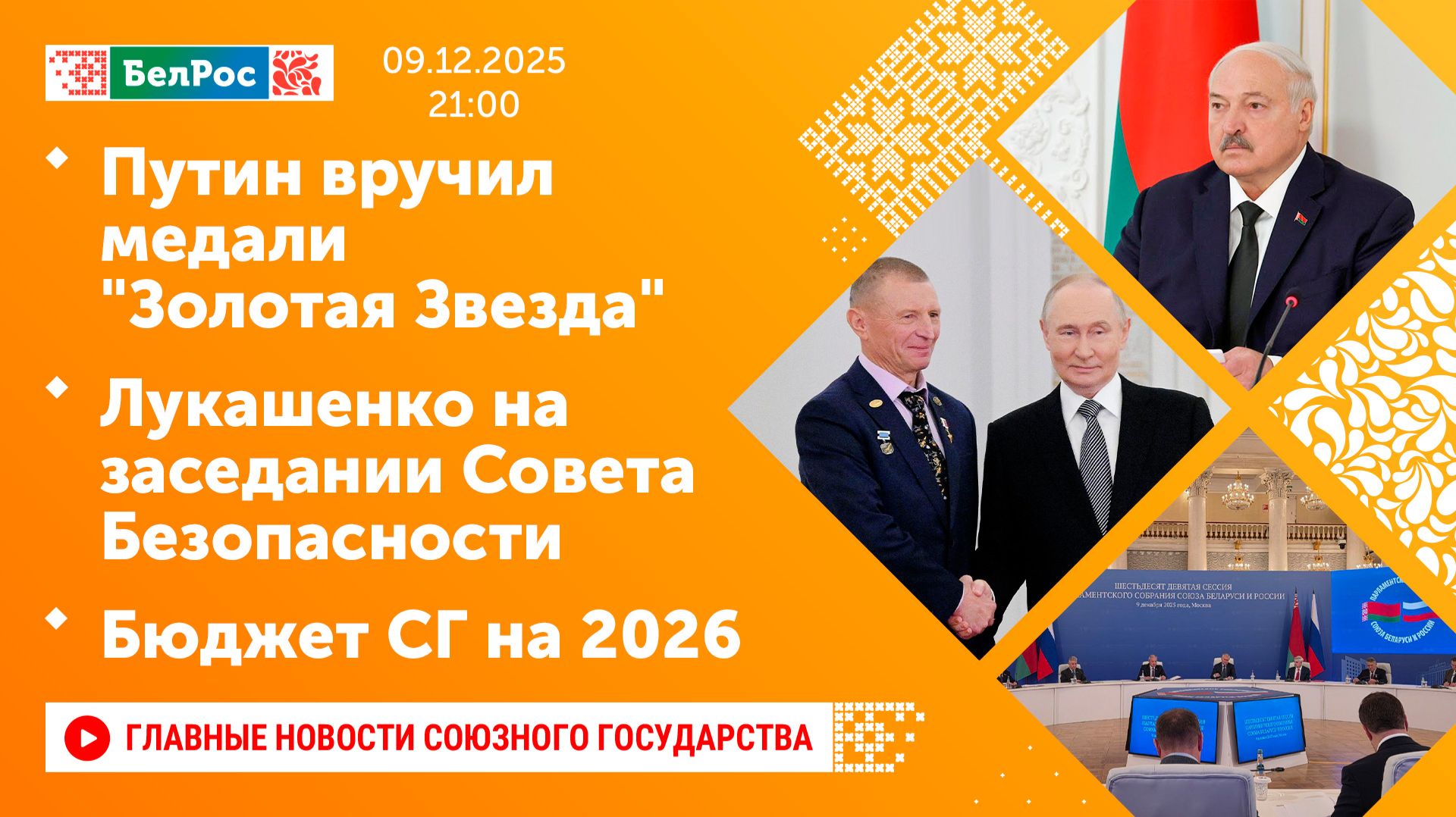 Закадровый текст озвучивает *ИИ Антон* Новости 09.12.2025 на 21:00 - Владимир Путин вручил медали "Золотая Звезда" Героям России в Кремлёвском Дворце. - Александр Лукашенко провёл заседание Совета Безопасноти. - В Москве прошла 69-я сессия Парламентского собрания Союзного государства. Смотрите главные новости Союзного государства на телеканале БелРос. Ссылки на наши соц. сети Сайт: http://belros.tv/ Telegram: https://t.me/belrostv Одноклассники: https://ok.ru/group/55657426976918 ВКонтакте: https://vk.com/belrostv TikTok: https://www.tiktok.com/@belros_tv?_t=... RuTube: https://home.strannik-j.org/channel/23501830/ Яндекс. Дзен: https://zen.yandex.ru/belrostvv Наши подкасты на Яндекс. Музыке: https://music.yandex.ru/album/25615251 #главныеновости #новостисегодня #СоюзноеГосударство
