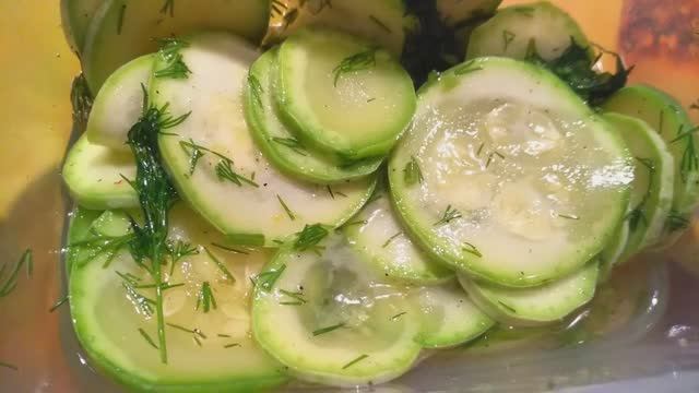 КАБАЧКИ 1 НЕБОЛЬШОЙ УКРОП ПАРУ ВЕТОК 70 МЛ ПОДСОЛНЕЧНОГО МАСЛА 2 СТОЛОВЫЕ ЛОЖКИ УКСУСА 2 СТОЛОВЫЕ ЛОЖКИ САХАРА 1 ЧЛ СОЛИ