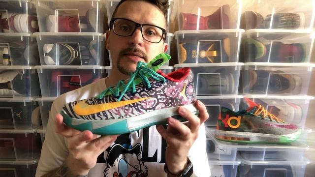 Обзор кроссовок KD6 "What the KD". Декодинг: 1. Именная модель баскетболиста Кевина Дюранта (Kevin Durant); 2. Год выпуска модели - 2013 год; 3. Год выпуска расцветки "What the" - 2014 год; 4. Дизайнер - Лео Чанг (Leo Chang); 5. Вдохновение для данной модели служили элитные наручные часы; 6. На язычках два разных логотип с оптической иллюзией, раскрывающие нам цифры «35» - соответственно игровой номер Кевина и «6» - номер данной модели; 7. На подметке есть шестиугольный узор который указывает на 6ю именную модель кроссовок Дюранта. Также как повествует история, то при пристальном взгляде на подошву обуви можно увидеть многослойные шестиугольные слои. Этот сложный узор построен вокруг отпечатка ступни Кевина, для этого ее проанализировали в лаборатории спортивных исследований Nike. Расцветка левого кроссовка: 1. Aunt Pearl – цветочная композиция; 2. Liger - размазня поверх цветочной композиции; 3. Maryland Blue Crab - сам swoosh и разноцветные брызки на нем; 4. Black History Month - на носке кроссовка фиолетовый цвет, золотая буква K на боковом логотипе KD и лого на подошве; 5. DC - на боковом логотипе буква D; 6. Meteorology - стелька и внутренняя обшивка; 7. Bamboo - рисунок на язычке; 8. Supreme DC Pre-Heat - Яркая голубая подметка; 9. NOLA Gumbo League - лого 35; 10. Oklahoma City Home и Oklahoma City away - треугольные узоры; Расцветка правого кроссовка: 11. Peanut Butter & Jelly - желейный свуш говорит о любимой еде Кевина; 12. Easter - Зеленый камуфляж; 13. Meteorology и Easter - бокового лого; 14. N7 - обшивка правого кроссовка; 15. Christmas - стелька; 15. Energy и NY 66 - смесь рисунка на язычке; 16. NOLA Gumbo League - мятная подметка 17. Christmas - лого KD с гирляндами на подошве.