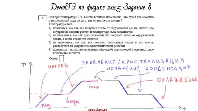 Разбор 8го задания из демоверсии ЕГЭ по физике 2015 года. ----------------- СпецКласс - это бесплатные видео уроки и онлайн вебинары, которые помогут вам в учебе, подготовке к ГИА и ЕГЭ и сдачи сессии. Видеоуроки длятся не более 5 минут, за которые вы сможете разобраться в решении сложных примеров или понять теорию. Все, что останется сделать - это решить свой пример по аналогии! ---------------- Остались вопросы? Пишите их в комментариях где удобно! Все уроки по порядку - http://specclass.ru/ Присылайте свои вопросы по решениям - http://vk.com/specclass Следите за новыми видео - http://facebook.com/specclass