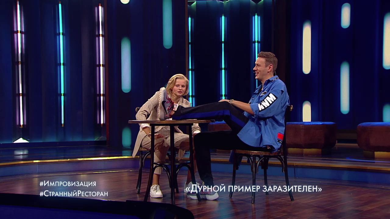 Импровизация "Странный ресторан". Александра Бортич оказалась в ресторане со странным названием. Таких ресторанов будет три. И все три названия ей нужно будет угадать. Подсказывать гостье будут актеры шоу Импровизация. Они исполнят роль официантов и посетителей, и попытаются максимально помочь. Названия у ресторанов следующие - "Дурной пример заразителен", "И хочется, и колется" и "Из князи в грязи".