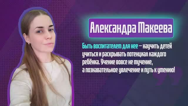 Александра Андреевна Макеева. Учительский стаж: 3 года. Место работы: МБОУ СОШ № 14 г. Владивостока. Учитель начальных классов. Место рождения: г. Находка. Окончила: Федеральное государственное автономное образовательное учреждение высшего образования "Дальневосточный федеральный университет", 2021 г. Профессиональная переподготовка по программе "Специальное (дефектологическое) образование: Олигофренопедагогика, 2022 г. Профессиональная переподготовка по программе "Социальный педагог. Воспитание и социализация личности в системе образования", 2022 г. Награды: Грамота за подготовку участников и победителя к участию в lV открытой научно-практической конференции" Наука - прошлое, настоящее, будущее", 2021 г. Благодарность от Думы города Владивостока, 2021 г. Благодарность от директора Института педагогики и лингвистика ВВГУ, руководителя ГМО г. Владивостока за подготовку участников и победителя историко - краеведческой конференции" Наследие - 2023", 2023 г. Участник городского конкурса "Молодой специалист года - 2021", 2021 г. Финалист городского конкурса" Молодой специалист года - 2022", 2022 г. Победитель всероссийского конкурса" Навигаторы детства 3.0. Федерального проекта "Патриотическое воспитание граждан Российской Федерации". Быть учителем для неё - научить детей учиться и раскрывать потенциал каждого ребёнка. Учение вовсе не мучение, а познавательное увлечение и путь к умению. Проект запущен по инициативе мэра Владивостока Константина Шестакова Делитесь нашим контентом и ищите нас в социальных сетях! ТГ: https://t.me/klassnyypodkast ВК: https://vk.com/public218702092