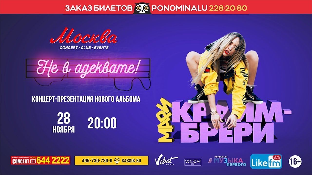 Билеты: ponominalu.ru/event/mari-krajmbreri Мари Краймбрери: "Москва! Я знаю, как вы этого ждали! И мы, наконец, сделаем это - ВМЕСТЕ С ВАМИ! 28 ноября в клубе "Москва Холл" состоится мой первый большой сольный концерт "Не в адеквате"! Ваши любимые песни и абсолютные премьеры - мы презентуем новый альбом! Спеши занять лучшие места - билетов не так много!;) ponominalu.ru/event/mari-krajmbreri"