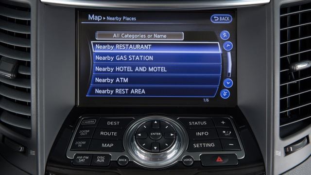 "This video is copyrighted material of Nissan North America, Inc. and should not be copied, edited, or reproduced without the permission of Nissan. The INFINITI Navigation System, if so equipped, uses a real-time map display and turn-by-turn voice instructions to help you navigate to your destination. The Navigation System starts when the ignition is in the ACC or ON position. This is your Navigation System’s control panel. Use the touchscreen to select items on the screen. You can also highlight items with the INFINITI Controller and then select them by pressing the ENTER button. The INFINITI Navigation System also has a directory of places of interest to assist the driver in finding locations, including: ● Gas stations, ● ATMs, ● Restaurants, ● Shopping centers, and ● Businesses. Once a destination is set and a route has been calculated, the system can provide: ● The turning direction at the next intersection, ● The name of the next street, ● The distance to the next intersection or to the end destination, and ● The estimated remaining time of travel to the destination. Please see your Navigation System Owner’s Manual for important safety information, system limitations and additional operating information. "