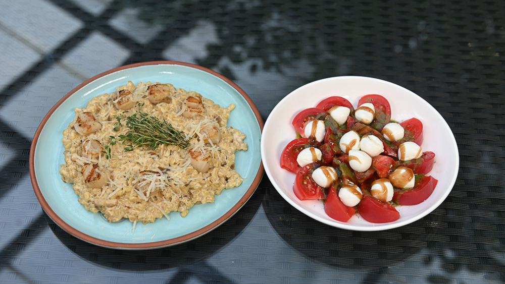 Перловка с белыми грибами и морскими гребешками. Салат из томатов и моцареллы