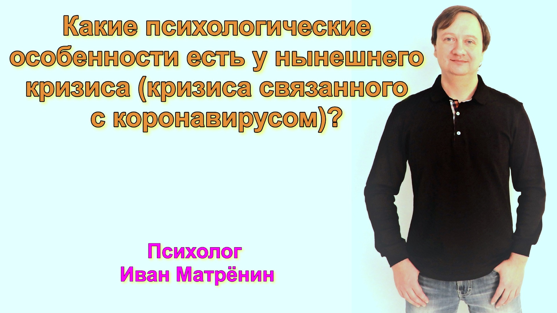 Какие психологические особенности есть у нынешнего кризиса (кризиса связанного с коронавирусом)? Этот кризис отличается от других. Обычно во время кризиса у человека есть возможность хотя-бы в движение и физическую активность сбросить внутреннее напряжение, в этот раз же, из-за коронавируса и самоизоляции у людей нет даже возможности это сделать! Если же к этому добавить ещё и то, что сейчас у людей ещё и ограничено личное пространство, что не добавляет спокойствия, то приходится признать, что психологического напряжения этот кризис может подарить очень много. Важно разобраться во всех особенностях происходящего, чтобы суметь управлять этим. В этом видео мы разбираемся в особенностях того, что происходит во время коронавируса. Подробнее, в этом видео. Приятного просмотра! Видео можно посмотреть на моём канале в YouTube - http://www.youtube.com/c/ПсихологИванМатрёнин. Ссылка на это видео в YouTube – https://youtu.be/KmetKRkY1a4. Также можете смотреть это и другие видео у меня в аккаунте Instagram - https://www.instagram.com/semein.psiholog/ в IGTV! Там много текстов и видео на эту и другие темы по психологии и отношениям. Контакты: эл. почта – myvan@mail.ru. Телефон, WhatsApp, viber, telegram - +7 965 605 46 99 Соц. сети: Сообщество Facebook: группа - Иван Матрёнин Психология отношений – https://www.facebook.com/ivanmatreninpsi адрес в одноклассниках личный - https://ok.ru/myvan адрес вконтакте личный – Иван Матрёнин – https://vk.com/matreninivan Получить консультацию online на b17 - https://www.b17.ru/matrenin/ Мои сообщества Вконтакте: группа – «Психология семьи и отношений. Иван Матрёнин» – https://vk.com/ivan_matrenin группа – «Психология на русском языке и для наших людей» - https://vk.com/psiholog_matrenin группа – «Стройность от психолога. Блог Ивана Матрёнина» – https://vk.com/stroinost_matrenin группа – «Про гипноз и НЛП» - https://vk.com/gipnoz_matrenin Вступайте, пишите! Ссылка на это видео в Rutube – https://home.strannik-j.org/video/e5314e822114eb5aca443ea20430377f/