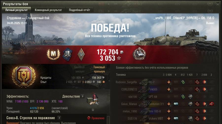 СТУДЗЯНКИ МАСТЕР на Об. 156 0 ОПЫТ: 1850 СУММАРНЫЙ УРОН: 7272 медаль СТАРКА