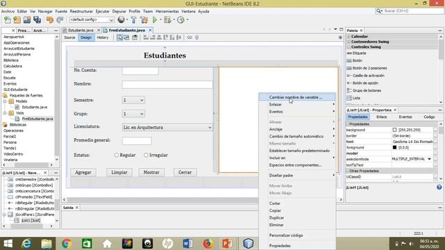 Video que muestra el desarrollo de una Interfaz Gráfica de Usuario en java, que utiliza un formulario para el ingreso de datos de estudiantes y los almacena en un ArrayList, además de implementar el funcionamiento de controles como JComboBox, JList y JRadioButton.