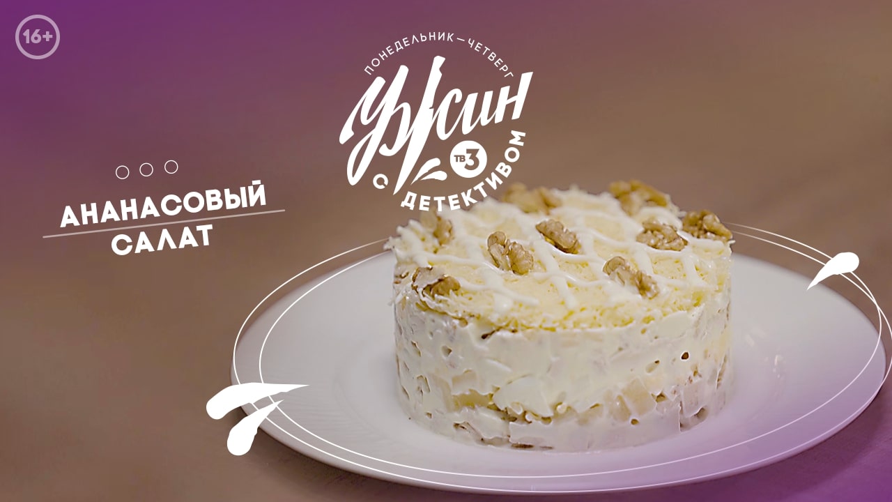 Как можно представить летний "Ужин с детективом" без салата? Фуд-блогер Элеонора Киракосян поделилась с нами рецептом своего любимого салата?? 16+ Для его приготовления нам понадобятся: Консервированный ананас – 1 банка Яйцо – 5 шт. Сыр – 150 г. Куриное филе – 500 г. Майонез – по вкусу Грецкий орех – 200 г. Соль, черный перец – по вкусу Шаг 1. Куриное филе, яйца отварить и мелко нарезать. Сыр натереть на терке. Шаг 2. На тарелку поставить разъемную форму и сформировать салат. Дно смазать майонезом и слоями выложить ингредиенты. Первый слой – куриное филе. Его посолить, поперчить, смазать майонезом и посыпать измельченными грецкими орехами. Шаг 3. Далее поочередно выкладывать остальные ингредиенты. В конце все посыпать сыром и майонезом нарисовать ромбики. Шаг 4. Затем в каждый такой ромбик выложить грецкий орех и украсить веточкой укропа. После чего подавать на стол. Идеальный легкий салат на ужин готов! Приятного аппетита!