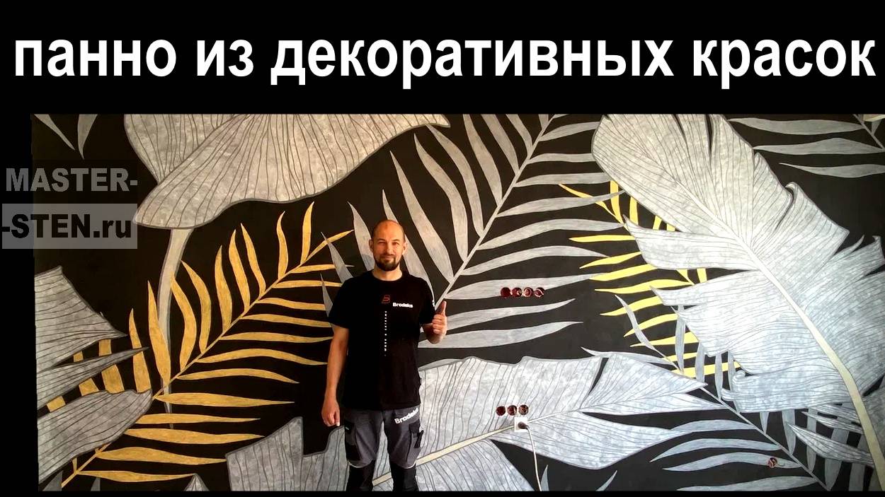 В этом видео я сделаю панно из декоративных штукатурок, а точнее декоративных красок. В работе буду использовать 3 вида покрытий. К плюсам данной работы можно отнести – прекрасное украшение интерьера, долговечность и моющие свойства поверхности, а также уникальную авторскую работу. Прежде всего стена должна быть ровной, гладкой, так как покрытия тонкие и обработана грунтом глубокого проникновения. Перед началом работ по краям на соседние стены клеим малярный скотч. Затем мы будем использовать фоновую грунт-краску. Она матовая и в цвет общего тона. По углам проходим кистью и маленьким валиком, а общую поверхность катаем большим. Краску хорошо раскатываем, чтобы не оставить шубы, просветов и полос от валика. Нужно добиться равномерной и однотонной поверхности, при необходимости покрасить стену еще раз. После высыхания можно отшлифовать стену наждачной бумагой это удалит засохший мусор, который иногда бывает в краске и поверхность станет чуть глаже – это важно для тонкослойных покрытий. Следующая на очереди – «Замша». Это декоративная краска, в данном случае черного цвета. Название говорит само за себя. В готовом варианте бархатистая и тактильно приятная матовая поверхность похожая на замшевую кожу или ткань. Это покрытие может наноситься кистью или валиком. В нашем случае кисть. Смотрится очень эффектно, но на первом слое заметны просветы подложки. Поэтому после высыхания приступим к нанесению второго слоя. Получается равномерно и красиво! Жаль, что камера не передает тактильных ощущений. Но поверхность очень приятная на ощупь! Далее мне понадобиться проектор, поэтому заклеим окна. Нужна темнота. У меня есть заготовленная картинка. Ее я разделил на 9 прямоугольников. Есть еще цветной эскиз. Помимо черного фона тут присутствуют еще четыре оттенка – желтый, золотистый, белый и серый. Для рисования я буду использовать декоративную краску «Мокрый шелк» и краску с песком. Чтобы прямоугольная стена разделилась ровно, на девять частей, нужно найти эти 4 точки. Что я и сделал с помощью лазерного уровня. И чтобы не пачкать стену, отметки сделаю на малярном скотче. И вот я уже настраиваю проектор с первым фрагментом будущей картины. Начинать, пожалуй, буду с самого большого элемента – белого листа. По его границе я поклею малярный скотч. Затем я буду брать небольшое количество шелковой краски на пластиковую кельму и круговыми движениями нанесу внутри оклеенного мной контура. Шелк сам по себе немного просвечивается, да к тому же еще и данная технология нанесения создает причудливые завитки, в итоге мы получим легкость композиции и прозрачность белых листьев. На следующем шаге, каждого фрагмента я прорисовывал прожилки белых листьев, используя кисть и шелк серого цвета. По началу я хотел использовать уже имеющийся серый цвет, заготовленный для пальмовых листьев, чтобы минимизировать количество цветов в композиции. Но он оказался слабо контрастным на белых листьях. И мне пришлось взять более темный оттенок. Так что в итоге серых получилось два. Для пальмовых листьев и более темный для прожилок белых листьев. Пальмовые листья я рисовал светло серым шелком и краской с песком в золотистой базе. Так передвигая проектор по меткам и загружая новый фрагмент, картина постепенно рисовалась моими руками, все более обретая целостный вид. Рабо