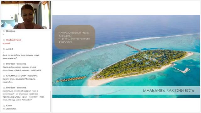 Вебинар от туроператора OneTouch&Travel по теме "Мальдивские острова. Новинки отелей". В программе вебинара: Сеть отелей Crown & Champa Resorts представила Анна Кривогуз - Sales & Marketing Manager. Трансляция непосредственно с Мальдивских островов с шикарным видом на солнечный пляж и море. Анна подробно рассказала об отелях: • Hurawalhi Island Resort • Kagi Maldives Spa Island • Veligandu Island Resort and Spa • Komandoo Island Resort and Spa • Meeru Island Resort and Spa • Vilamendhoo Island Resort and Spa • Kuredu Island Resort and Spa • Innahura Maldives Island Также в программе вебинара два отеля Brennia Kottefaru и Reveries Diving Village от представителя Лилианы Наша.