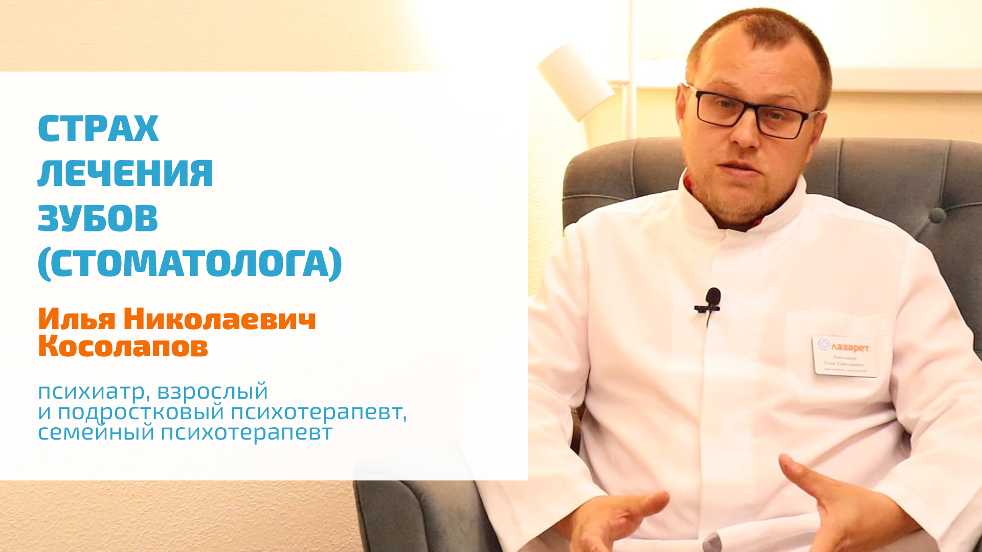 #ПСИХОЛОГИЯ #ПСИХИАТРИЯ #ЗДОРОВЬЕ https://lazaretspb.ru/psihiatriya/ 00:00 • Страх стоматолога 00:23 • Симптомы и признаки стоматофобии 01:34 • Лечение страха стоматолога, лечения кариеса и удаления зубов 04:28 • Сроки и результаты лечения ммпосещения стоматологической клиники Подробнее о лечении страха стоматолога (стоматофобии, боязни лечения кариеса и удаления зубов) рассказывает Илья Николаевич Косолапов — психиатр, врач-психотерапевт, специалист по подбору психофармакотерапии. ? ЗАПИСЬ, КОНСУЛЬТАЦИЯ МЫ РАБОТАЕМ КРУГЛОСУТОЧНО, БЕЗ ВЫХОДНЫХ Если у Вас возникли вопросы о вариантах лечения психических расстройств и зависимостей, наши операторы ответят на них. Звоните — мы работаем круглосуточно, в том числе в выходные и праздничные дни. +7 (812) 604-33-30 8 (800) 300-64-39 ? ГОСПИТАЛИЗАЦИЯ В СТАЦИОНАР ИНОГОРОДНИМ, ЖИТЕЛЯМ БЛИЖНЕГО И ДАЛЬНЕГО ЗАРУБЕЖЬЯ Для иногородних, жителей ближнего и дальнего зарубежья, желающих пройти полноценное лечение в психиатрическом или наркологическом стационаре нашей клиники, возможна консультация по Skype, WhatsApp, Viber, Telegram. Напишите нам на адрес электронный почты, указав в письме контактную информацию, причину обращения, удобное для Вас время звонка. info@lazaretspb.ru ? КЛИНИКА ЛАЗАРЕТ — ОСОЗНАННЫЙ ВЫБОР ПСИХИАТРИЯ, ПСИХОТЕРАПИЯ, НАРКОЛОГИЯ И ПСИХОЛОГИЧЕСКАЯ ПОМОЩЬ Клиника Лазарет — одна из старейших клиник Санкт-Петербурга, специализирующаяся на помощи людям с легкими, пограничными и тяжелыми расстройствами психики, различными зависимостями. Также мы помогаем родственникам пациентов на всех этапах лечения — от мотивации к прохождению полноценного лечения, до ресоциализации — момента возвращения человека в общество и в семью, требующего специализированной психологической помощи и коррекции поведения. https://lazaretspb.ru https://vk.com/klinikalazaret