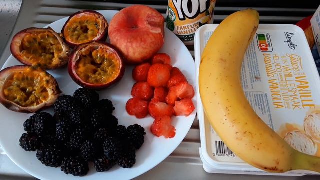 Коктейль из фрукты с добавлением йогурта и мороженого, без сахара. Фрукта на выбор. Банан, ежевика, клубника, персик, маракуйя. Фрукту промыть, порезать и сложить в форму. Добавить йогурт и мороженое, пробить блендером до однородности.