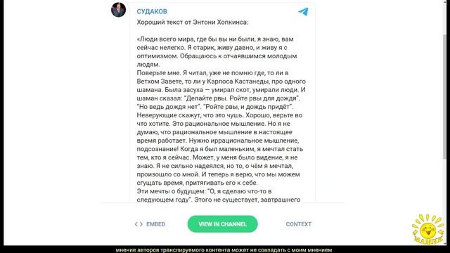 Хороший текст от Энтони Хопкинса https://t.me/sudakovss/3673 донат (все платежные системы) - https://www.donationalerts.com/r/mamik Я-деньги: 410014756131712 карта - 5559 4936 9802 4156 https://www.youtube.com/channel/UCtT3kBkJQX8N6Gzuzye3lLw https://www.youtube.com/channel/UCPTuXe75sfawj1wdq1_2KHw https://home.strannik-j.org/channel/10789710/ https://vk.com/club103200051 https://t.me/nar_dip