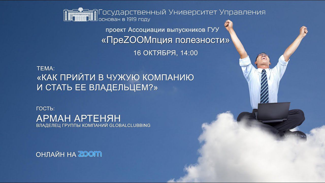 #ПреZOOMпция полезности: «Как прийти в чужую компанию и стать ее владельцем?» На этой неделе вышел очередной выпуск нового сезона «ПреZOOMпции полезности»! Гостем стал Арман Артенян – выпускник ГУУ, владельцем группы компаний GLOBALCLUBBING. Тема выпуска: «Как прийти в чужую компанию и стать ее владельцем?» В рамках темы поговорили с Арманом о том, как сейчас оживает Event-рынок, какие есть особенности в работе с зарубежными артистами, как провалить международный event, а также как создать с нуля свою компании.