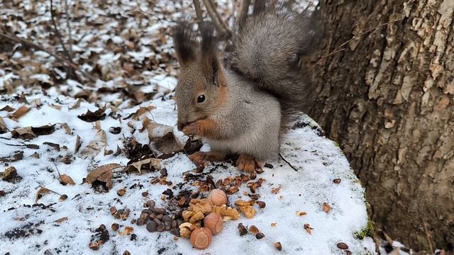 Белка ест орехи и ворчит