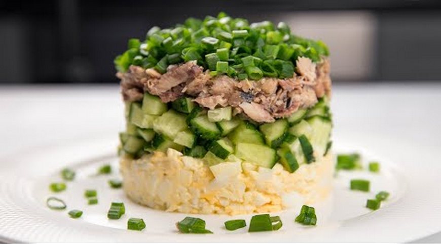 ✳️ САЛАТ С САЙРОЙ Ингредиенты: - 2 свежих огурца - 3 вареных яйца - Пучок зеленого лука - Майонез - 200гр консервированной сайры Огурцы, яйца и зелень нарезаем. Для подачи используем кольцо. Выкладываем часть яиц, смазываем майонезом и выкладываем оставшиеся яйца. Снова смазываем майонезом. Далее слой огурцов, подсаливаем. Сайру разминаем вилкой, выкладываем следующим слоем и сверху посыпаем зеленым луком.